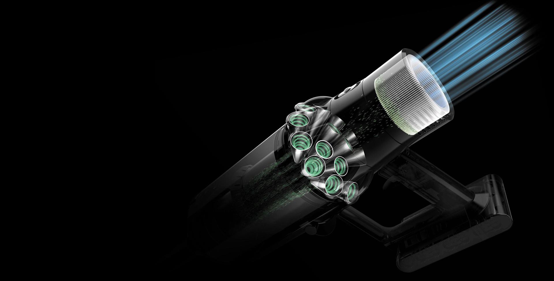 Odkurzacz Dyson Cyclone V10™ posiada filtrację całego systemu do wychwytywania zanieczyszczeń, dzięki czemu 99,97% zanieczyszczeń o wielkości nawet 0,3 mikrona1