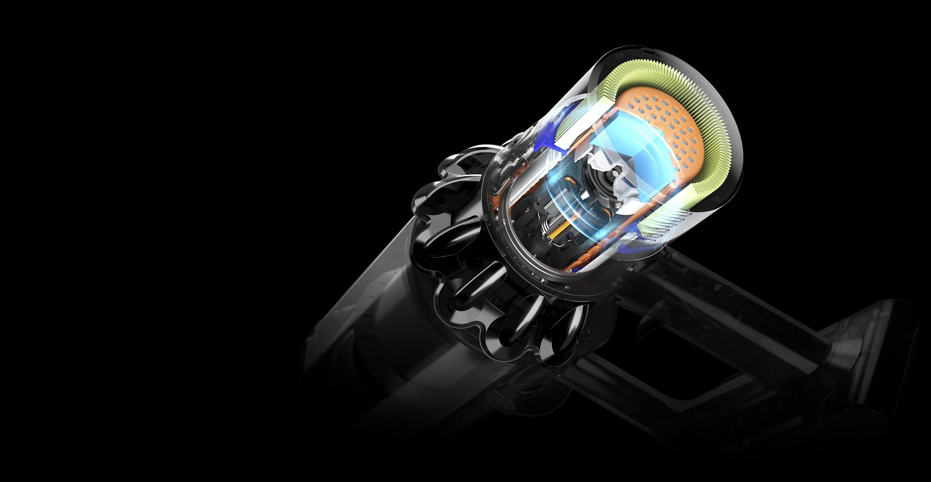 Najmniejszy i najlżejszy, a przy tym najmocniejszy silnik do odkurzacza wyprodukowany przez firmę Dyson. Jego ceramiczny wał utwardza się w temperaturze 1600°C, dzięki czemu jest trzy razy bardziej wytrzymały od stali pomimo o połowę mniejszego ciężaru właściwego. Dzięki przesunięciu wirnika z przodu do tyłu silnika przepływ osiowy zaciąga chłodniejsze powietrze, obniżając temperaturę i umożliwiając pracę silnika z prędkością do 125 000 obr./min. A to z kolei wytwarza moc ssania odkurzacza przewodowego.¹