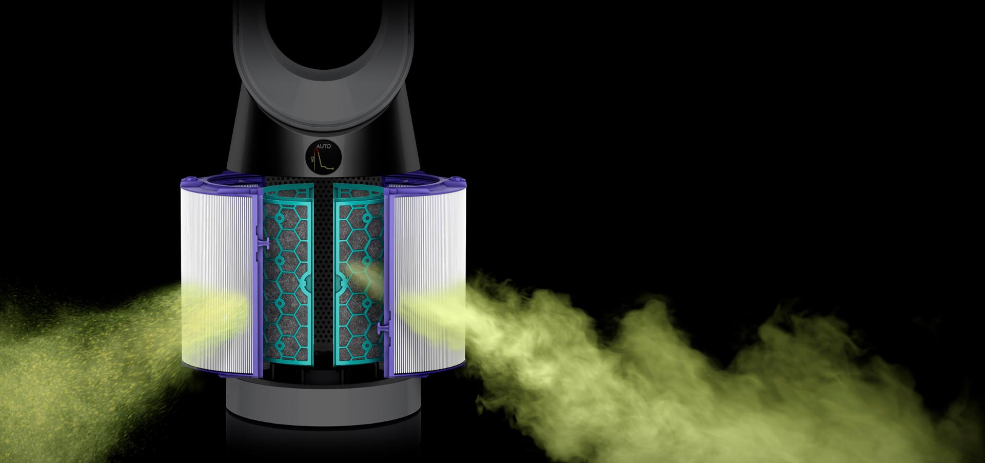 Oczyszczacze Dyson wykrywają i wychwytują 99,95% ultradrobnych cząsteczek i zanieczyszczeń, a następnie rozprowadzają po całym pomieszczeniu oczyszczone powietrze.²